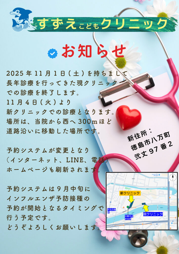 2025.09.03 クリニック移転のお知らせ 令和7年11月4日(火)より新クリニックでの診療となります。当院から西へ300mほど道路沿いに移動した場所です。 < 一覧へ戻る > アーカイブ ・2025.09(4)